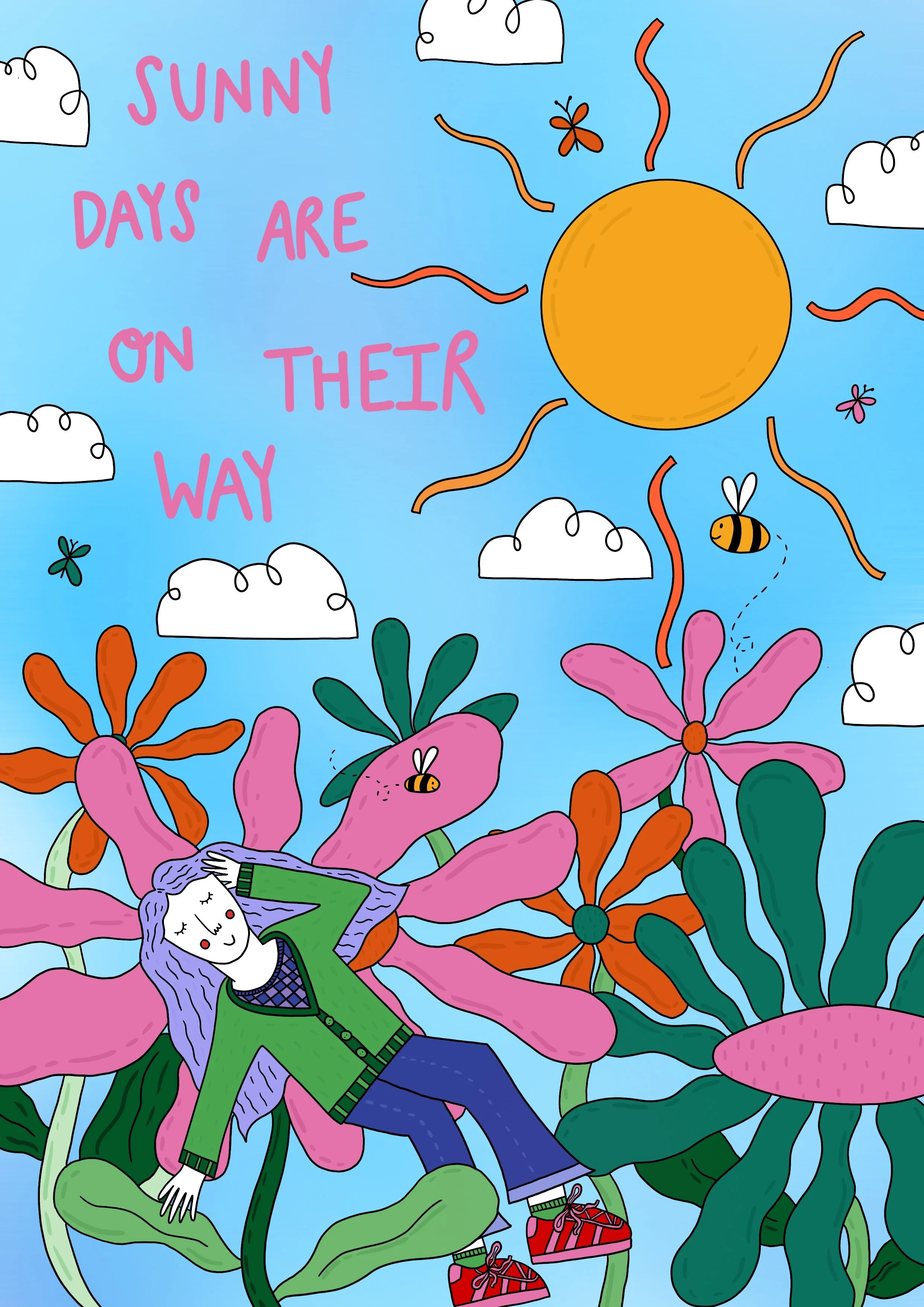 A personal illustration encouraging positivity on cloudy days.